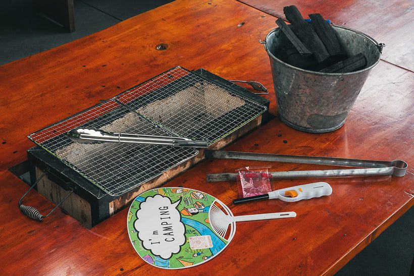 - BBQ道具一式(コンロ、アミ、トング、火バサミ、炭、着火剤、うちわ)