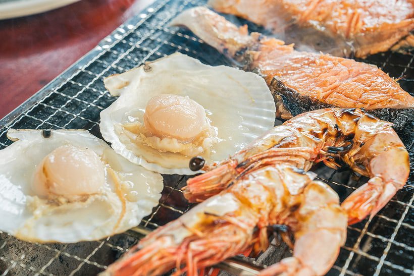 有頭海老(1匹)、片貝ホタテ(1枚)、サーモン(1切)- セット内容