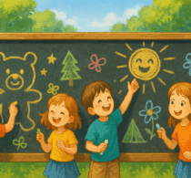 大きな黒板にチョークを使って、木の葉や虫、キャンプの思い出など思いのままに描いてみよう!自然に囲まれた開放感のなかで子どもたちの感性ものびのび広がります。