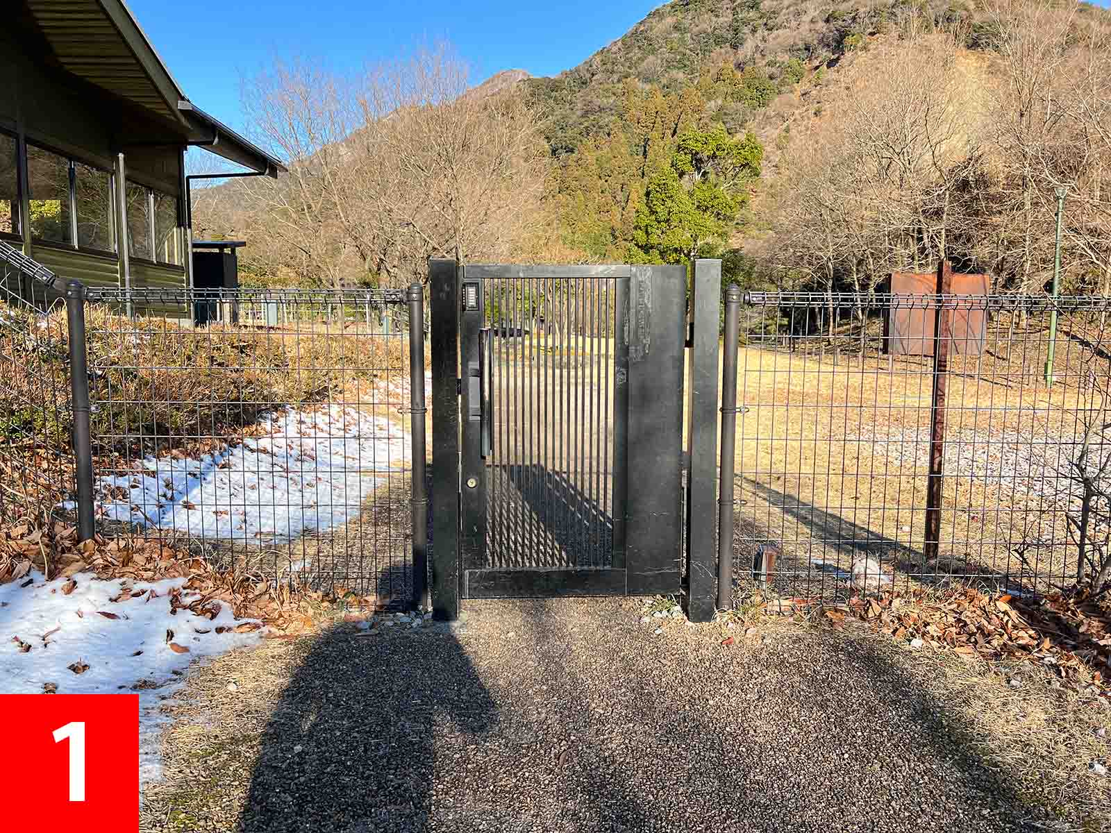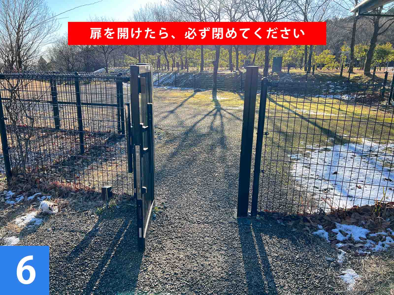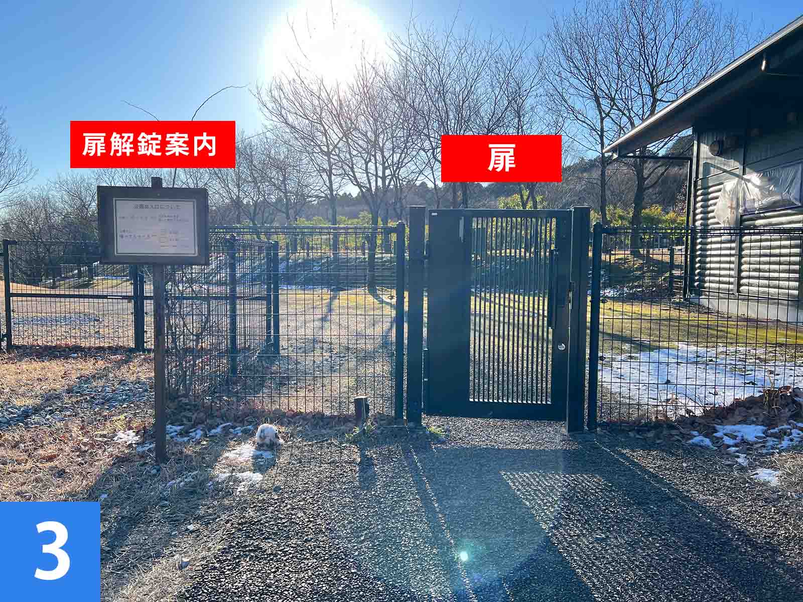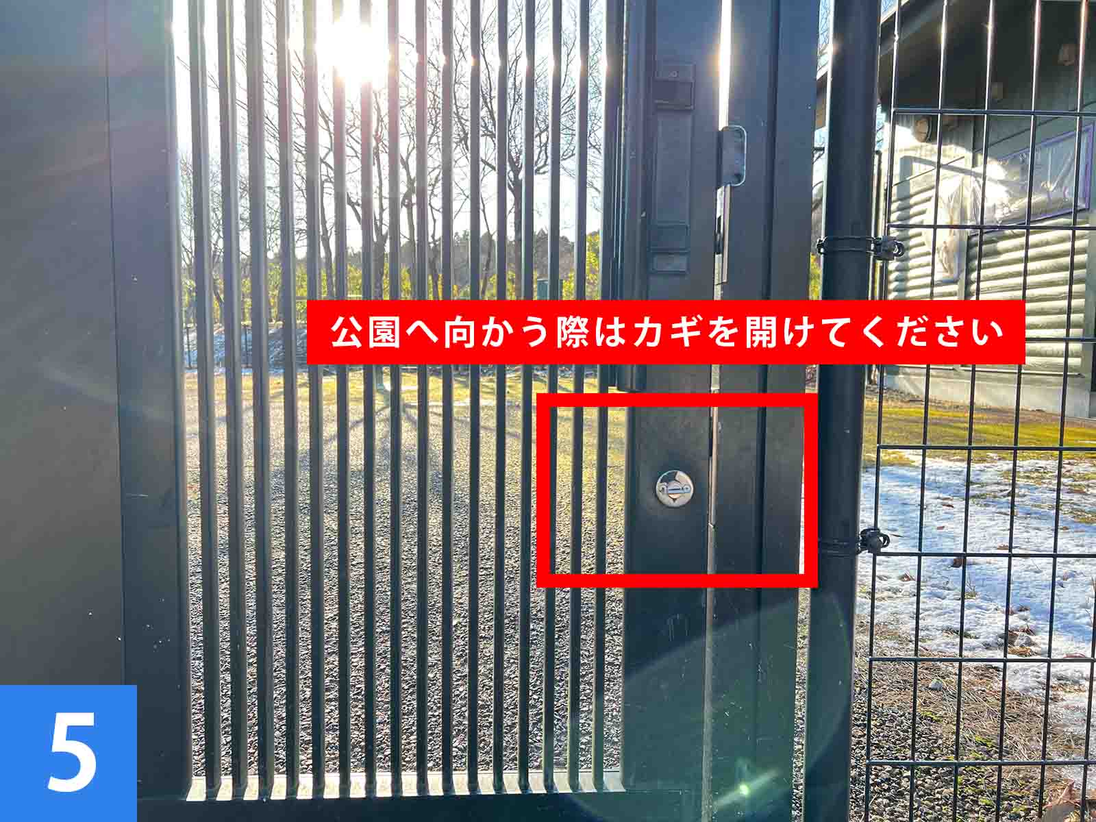 | ①:サニタリー2番へ向かいます。 ②:灰捨場付近の手すり付き階段を降り、右手へ向かいます。 ③:扉と扉解錠案内があります。 ④:公園への行き方、公園からの帰り方を確認してください。 ⑤:鍵を手動で解錠してください。(扉は固いため強めに引っ張ってください) ⑥:扉を開けたら、必ず閉めてください ⑦:公園の遊具をお楽しみください。 |