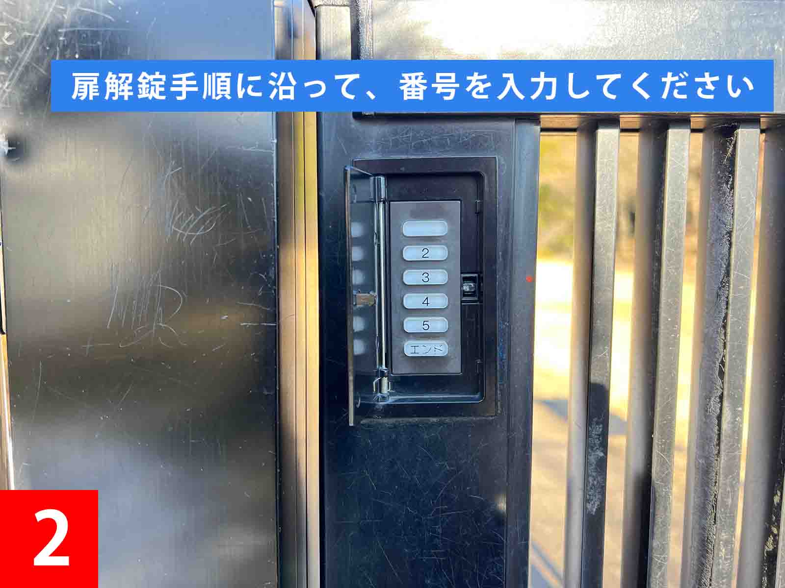 | ①:扉へ向かいます。 ②:扉解錠手順に沿って、番号を入力してください。(番号が合っていたら自動で解錠されます。) |