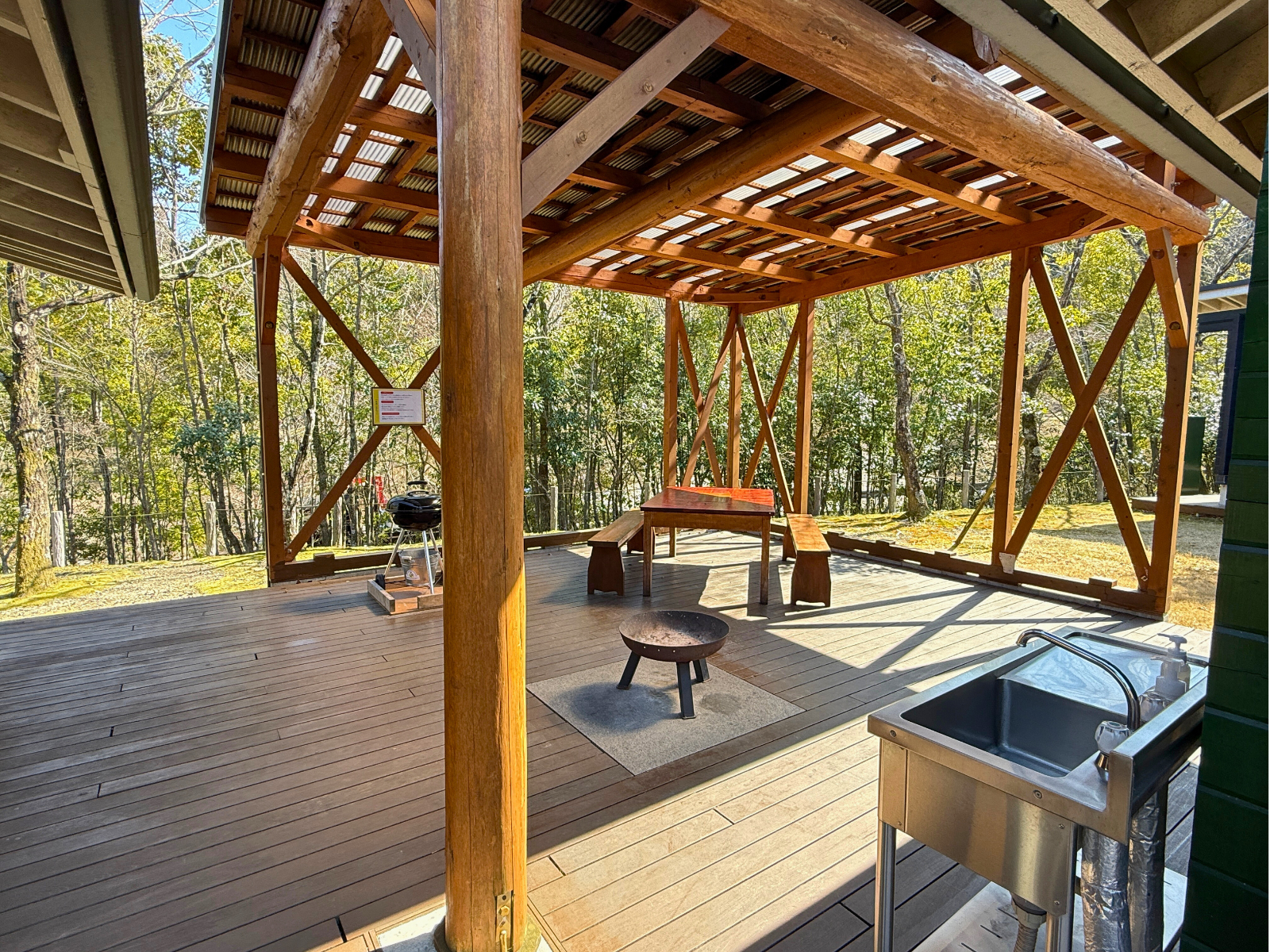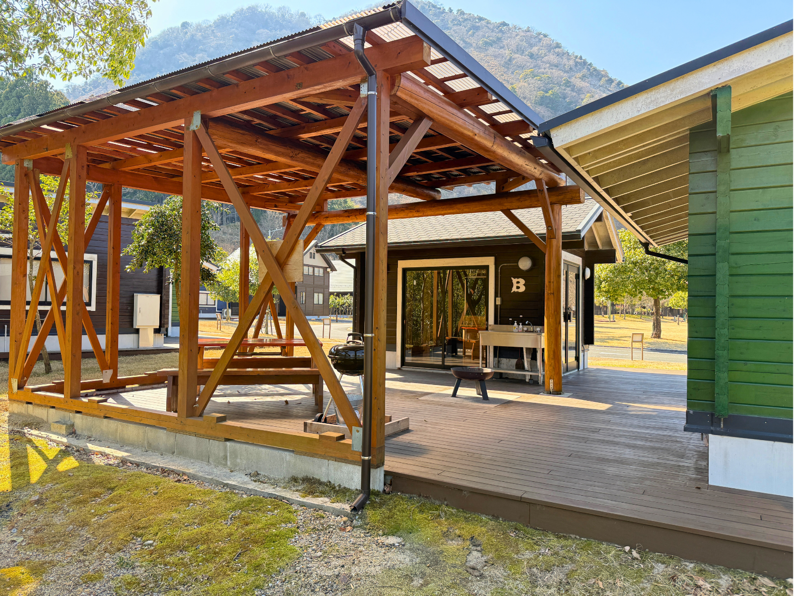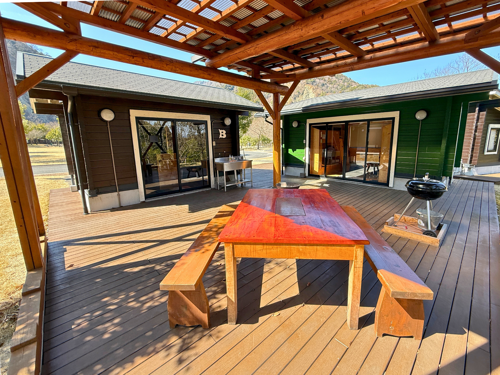 | 2区画 | 【キャビングサイト共通】 BESSのIMAGO(リビング棟、宿泊棟)、屋根付きウッドデッキ、給湯器付きシンク、冷蔵庫、トイレ、エアコン、焚火台(火バサミ付)、2段ベッド×2台(幅120cm×奥行180cm)※マットレスと敷シーツ有。掛布団や枕はございません。 【“食”-FOOD-〈テーマ備品〉】 IHコンロ(1口用)、BBQコンロ、ホットサンドメーカー |