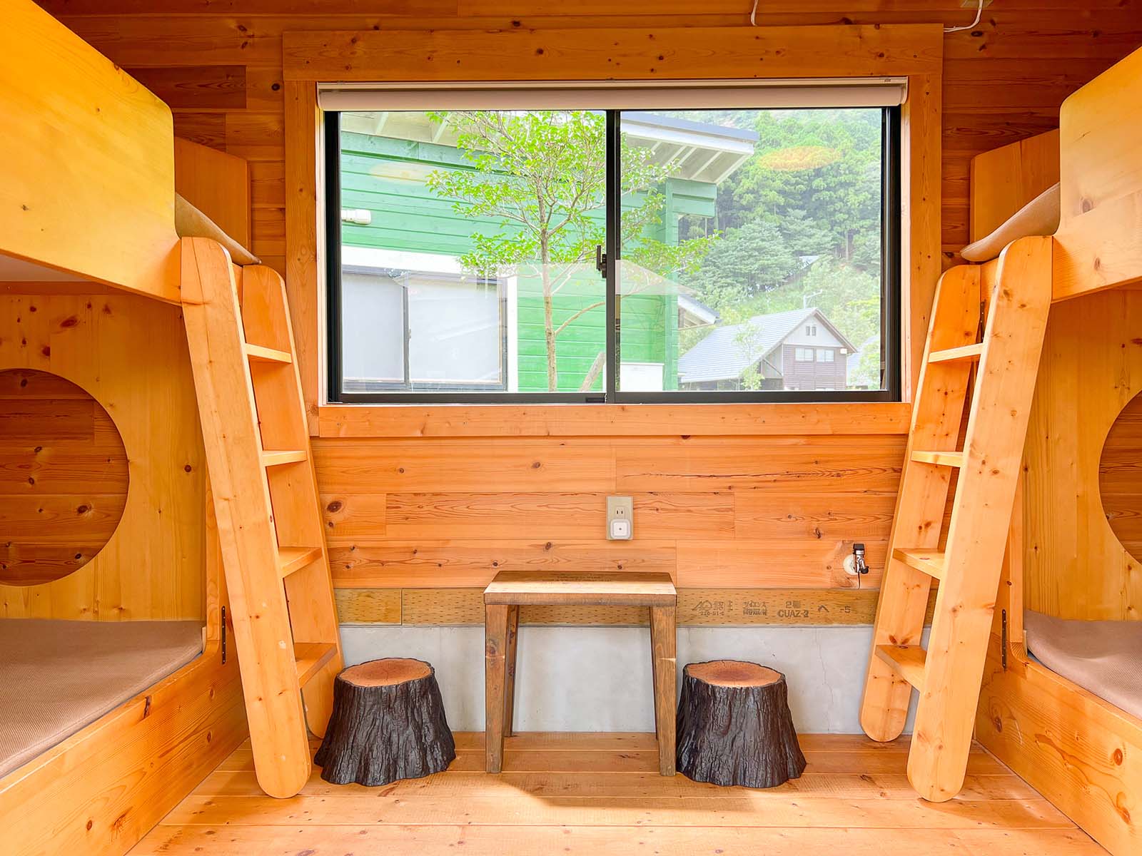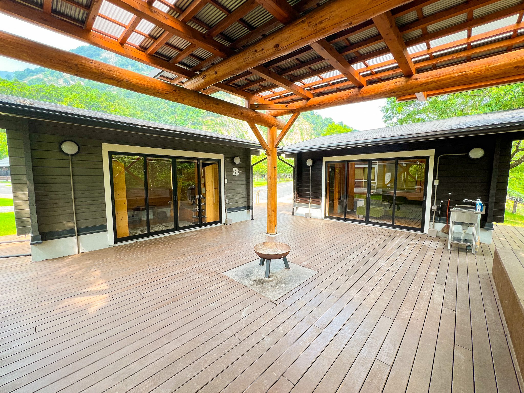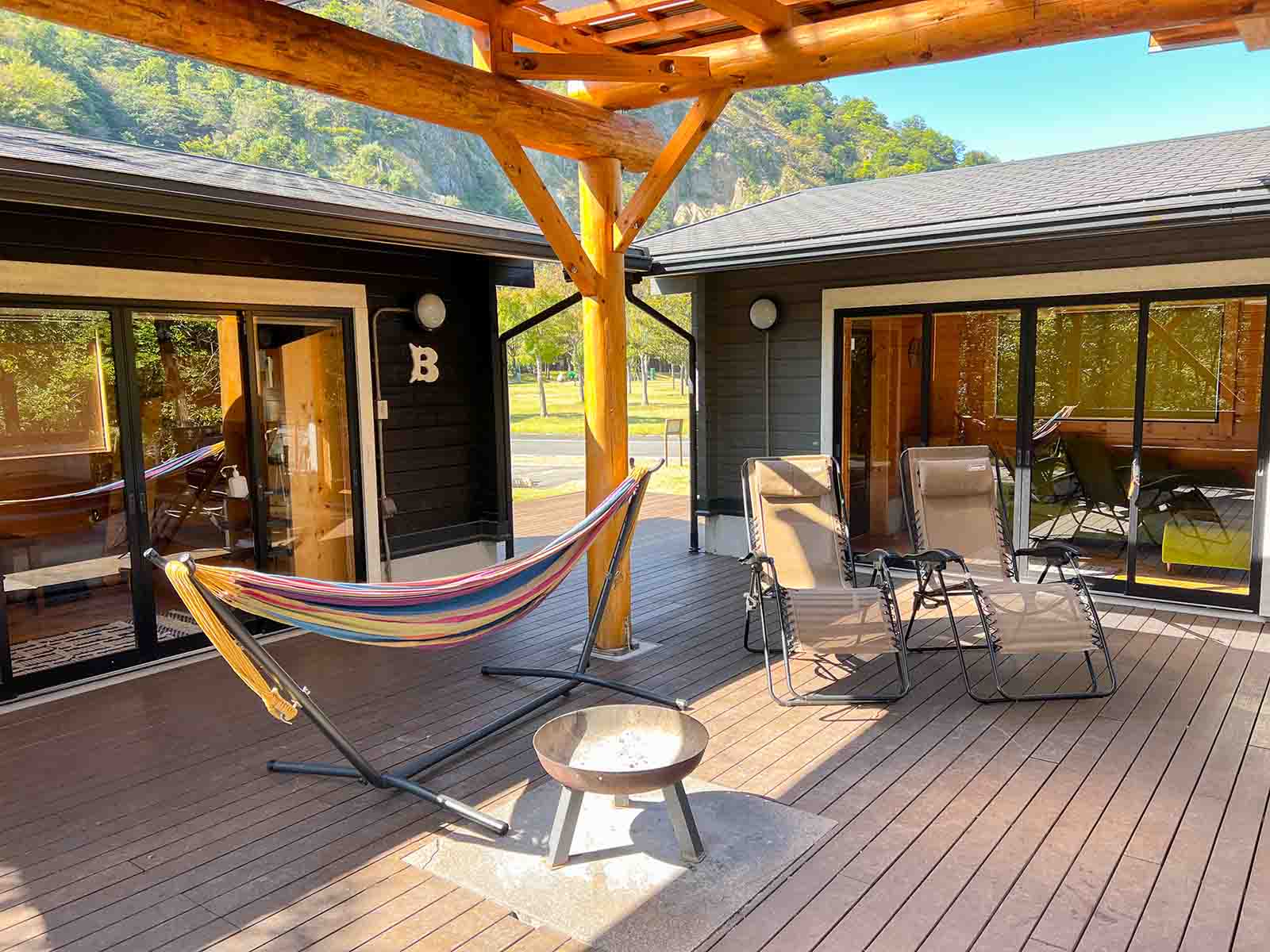 | 2区画 | 【キャビングサイト共通】 BESSのIMAGO(リビング棟、宿泊棟)、屋根付きウッドデッキ、冷蔵庫、トイレ、エアコン、焚火台(火バサミ付)、2段ベッド×2台(幅120cm×奥行180cm)※マットレスと敷シーツ有。掛布団や枕はございません。 【“癒”-RELAX-〈テーマ備品〉】 ハンモック(ダブルサイズ)×1、リクライニングチェア×2 |