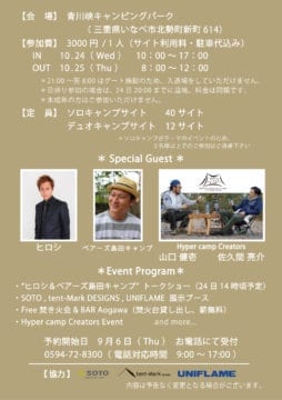 記念すべき第1回目のゲストは、キャンプ動画をアップするYoutubeチャンネルで話題の芸人「ヒロシ」と「ベアーズ島田キャンプ」。キャンプに関する様々な情報を発信するブログなどを運営する「Hyper Camp Creators」より佐久間亮介&山口健壱のお二人が、トークショーやイベントで盛り上げてくれます☆