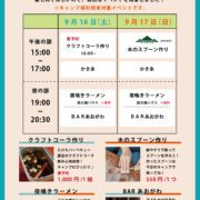 木のスプーン作りや、クラフトコーラ作り、夜鳴きラーメン、BARあおがわ、かき氷販売を予定。